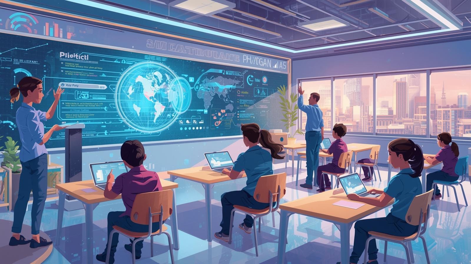 A classroom equipped with AI-driven tools that automate admin work and personalise student learning experiences.